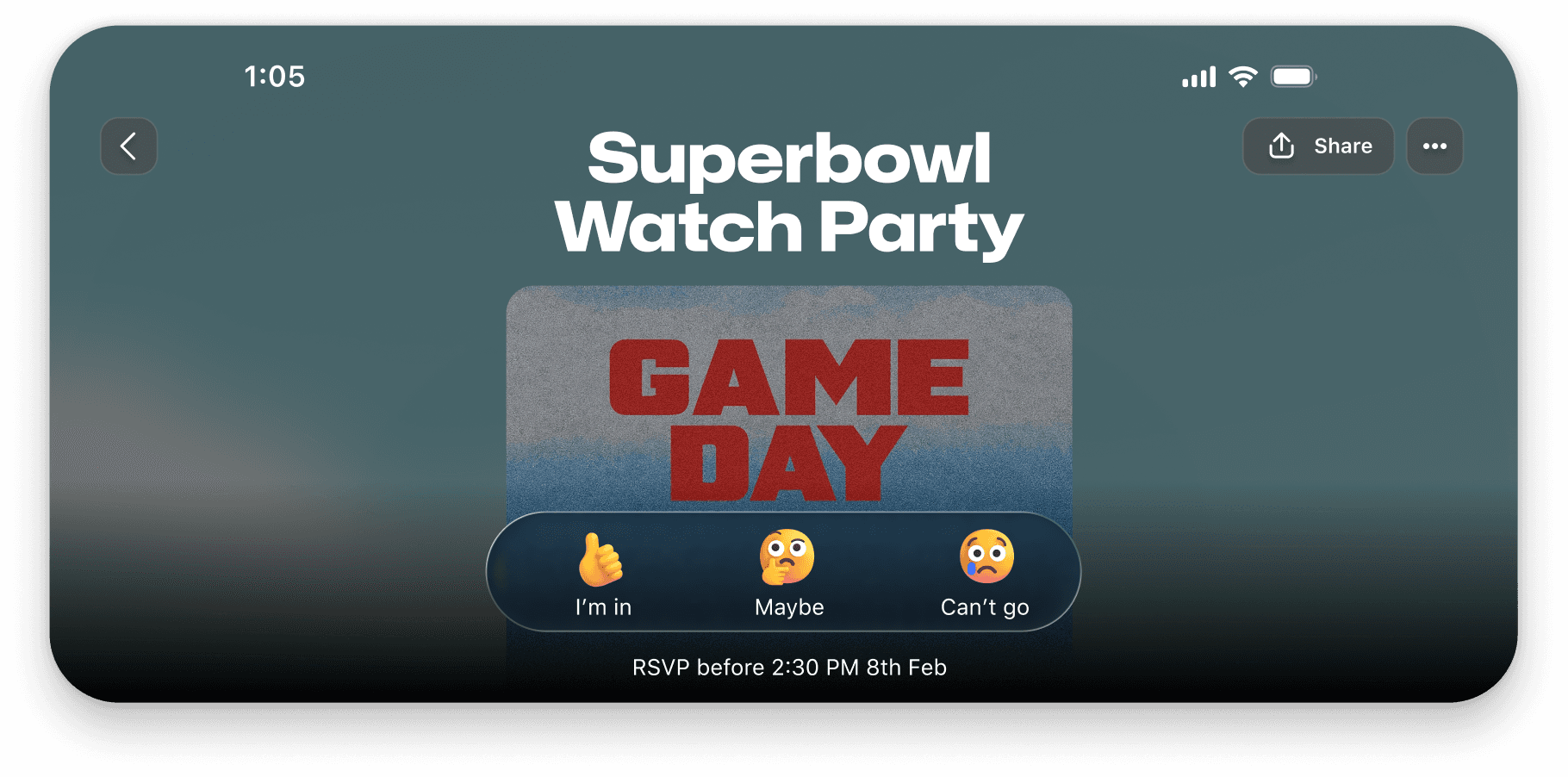 • Share the invite link everywhere so friends can RSVP from the web or app.